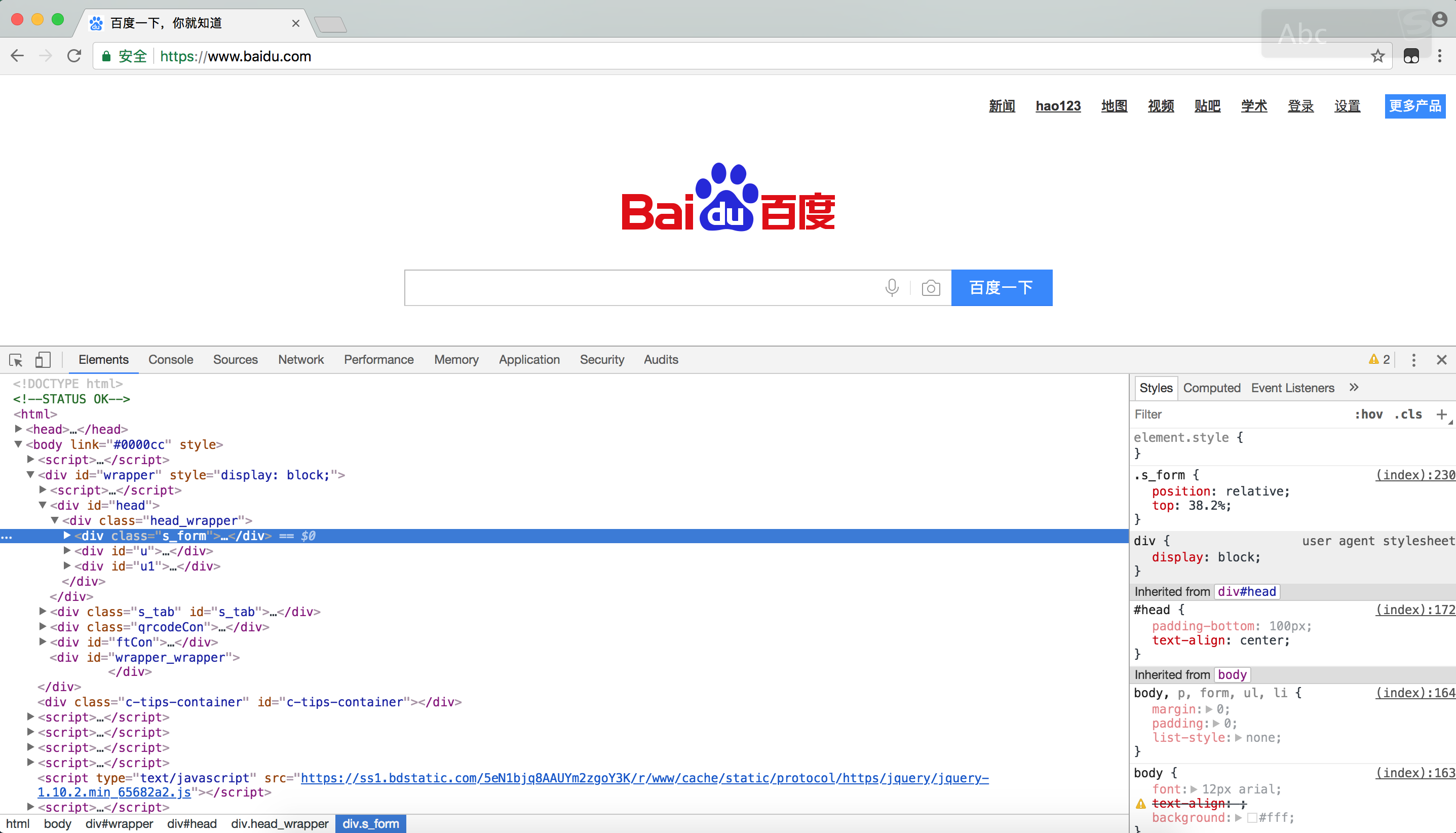 上面的这段代码作用是向url:‘https://www.baidu.com’ 所在的服务器发送请求,显示的html显示这是一个跳转,转到’http://www.baidu.com’, 服务器返回的就是上面的html代码,我们看到的就是: