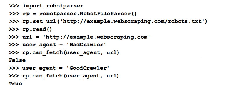 我们上一篇提到过robots.txt,里面有一些可以访问以及不可以访问的路径,我们可以通过python工具包robotparser来自动解析使用(贴一段书上的截图吧):